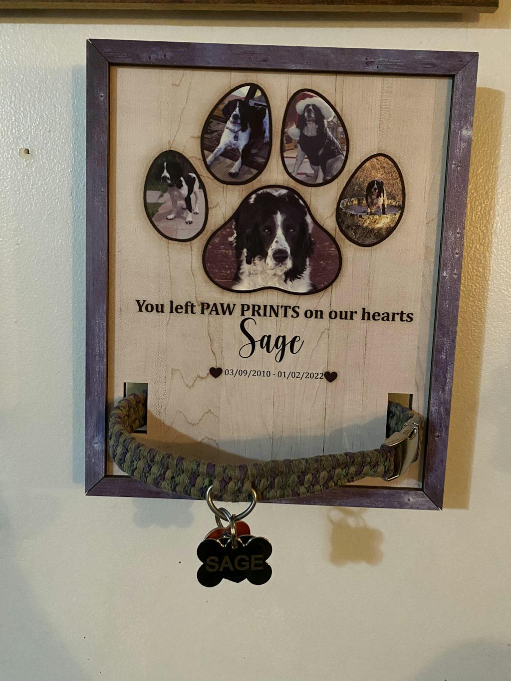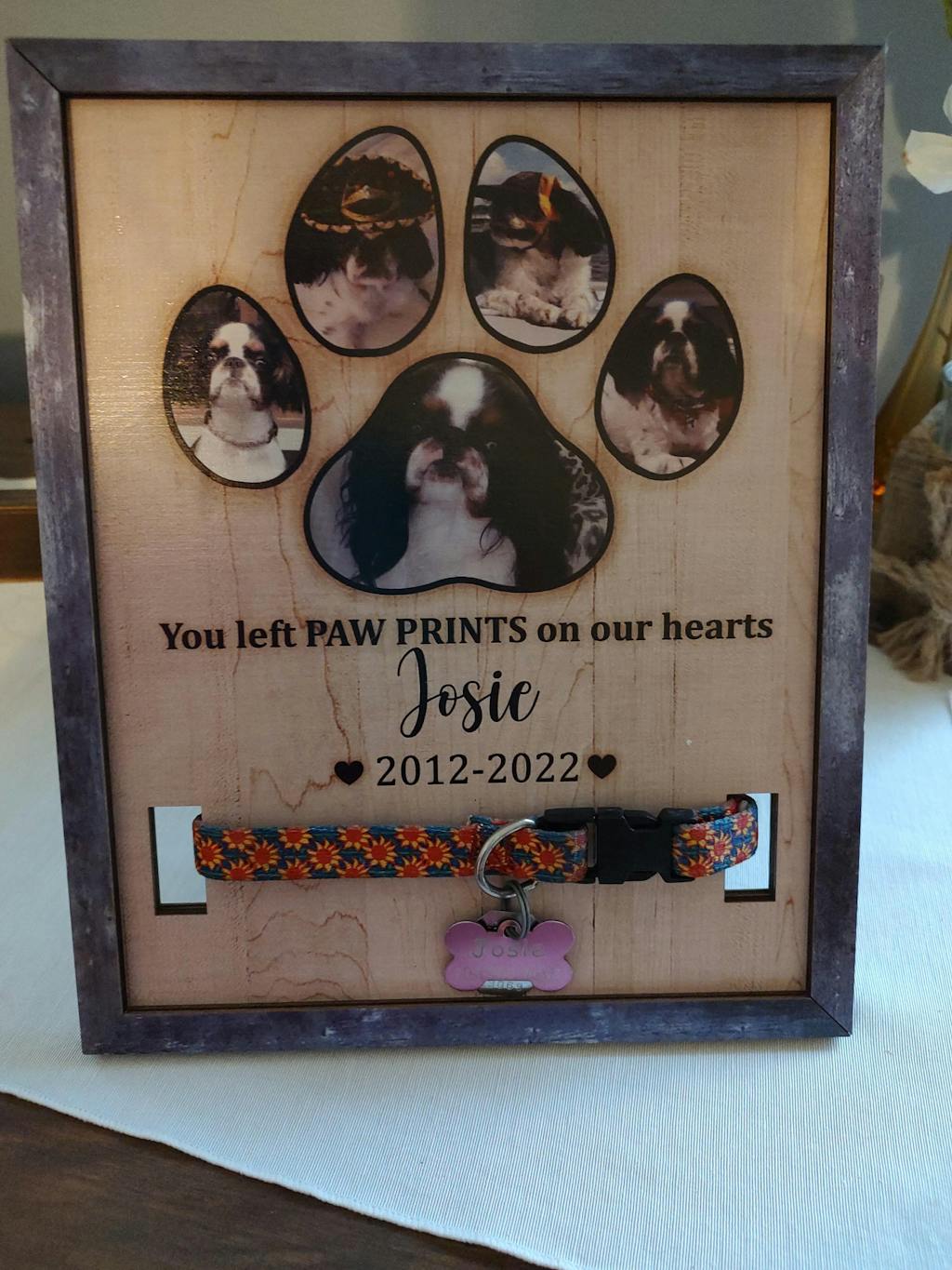 Pets are family and it’s heartbreaking when they cross the rainbow bridge. And dog’s, cat's collars in a memory box for years and we thought it was time to celebrate their lives and showcase their memories in a better way, so we created these pet memorial signs to showcase each of their individual collars, and be able to see them every day. These beautiful wooden signs are a sweet reminder that although they are gone, they are not forgotten. Each sign is individually handmade to celebrate your beloved pet's life and keep their memory alive.