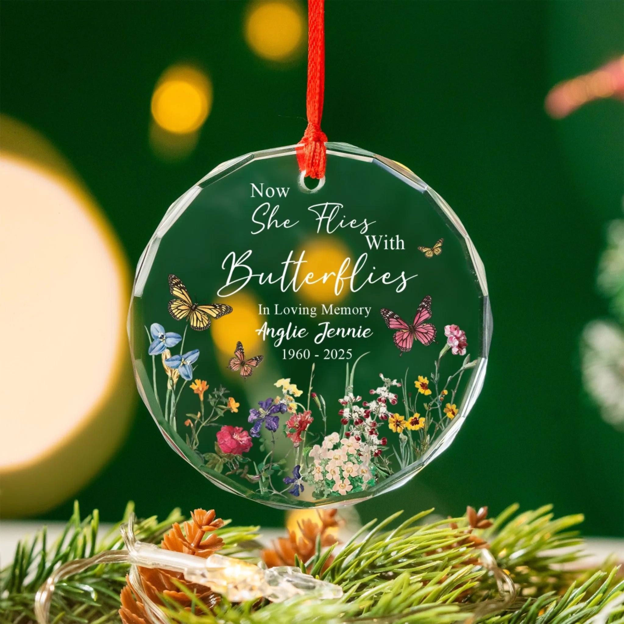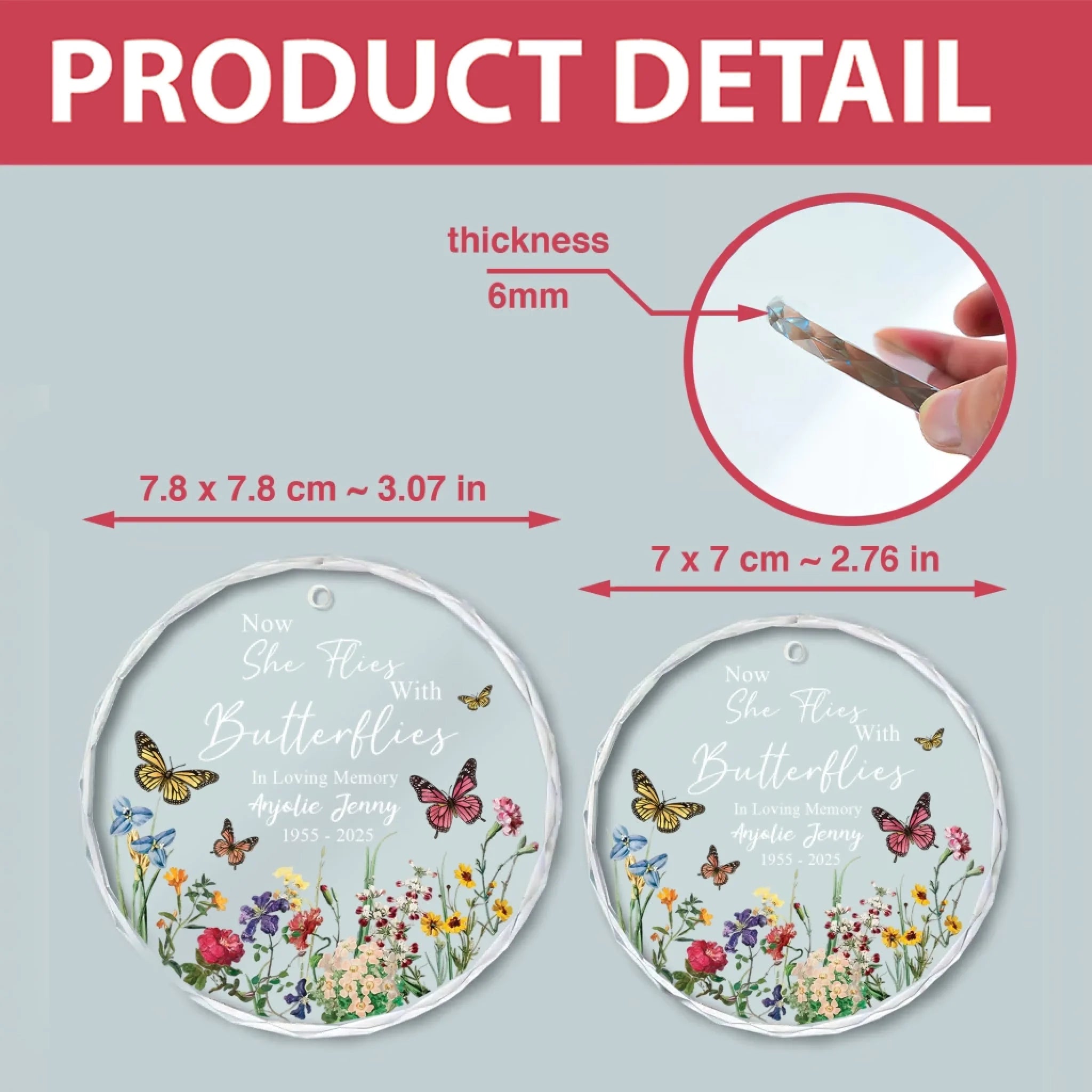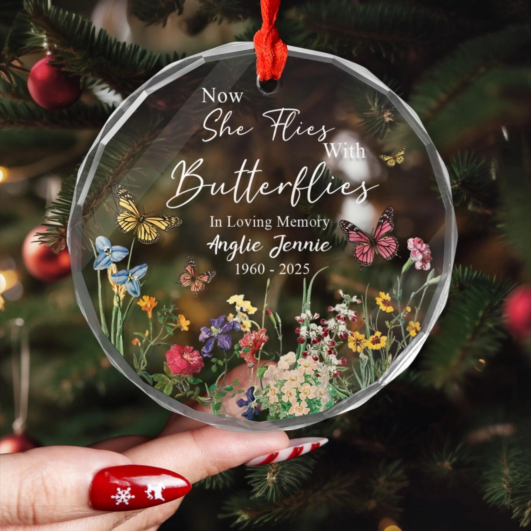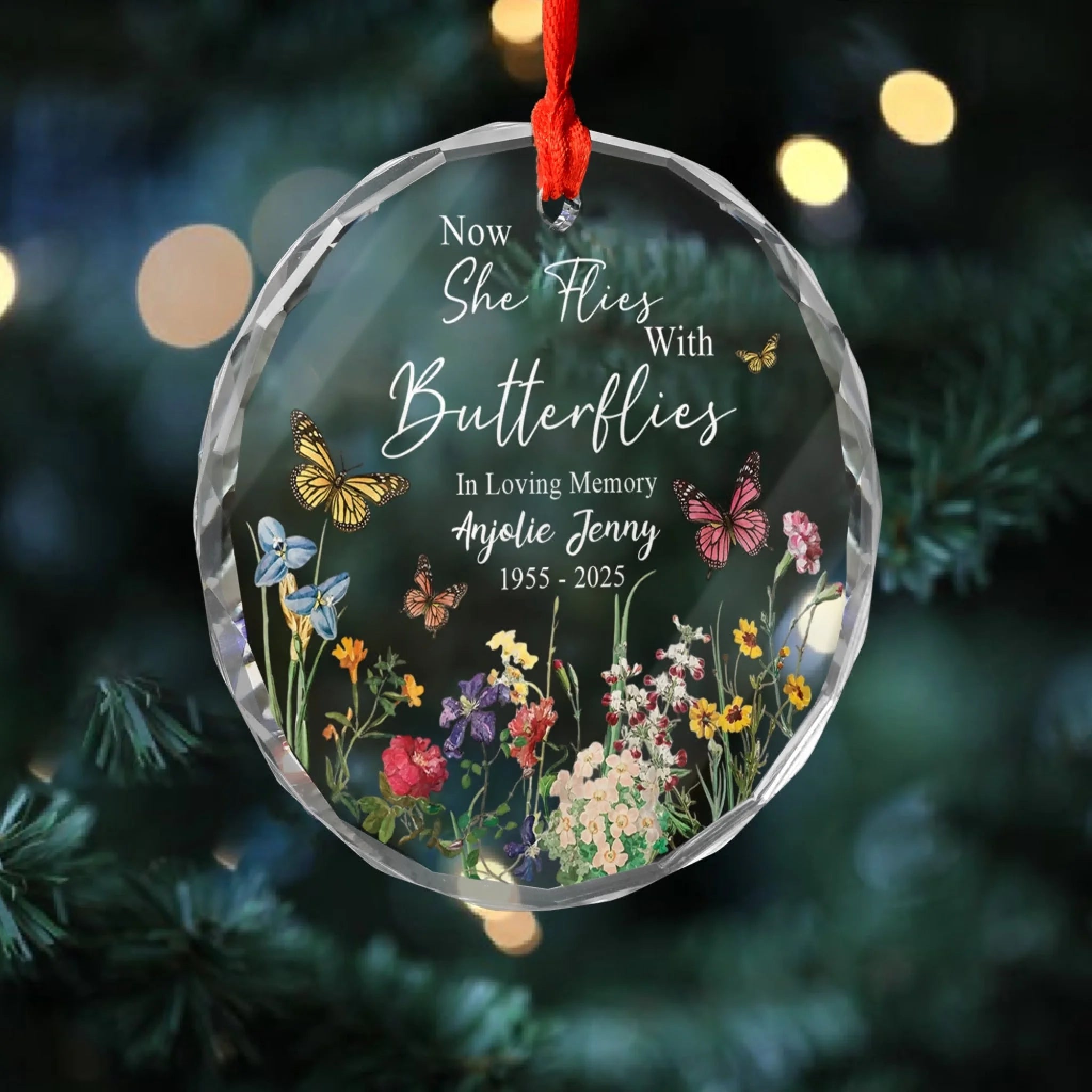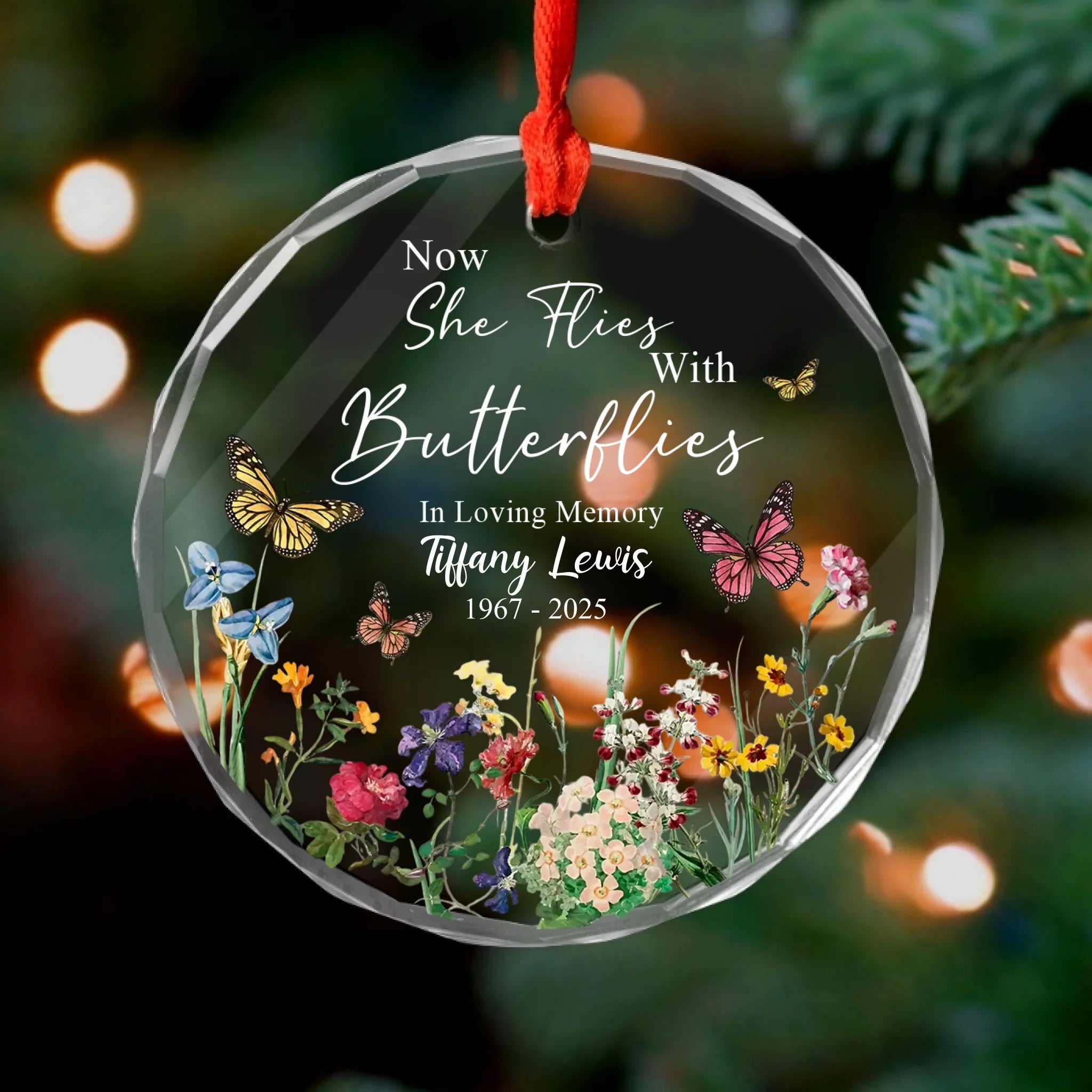 In Loving Memory Gift, Now She Flies With Butterflies - Personalized Glass Ornament, Memorial Gift